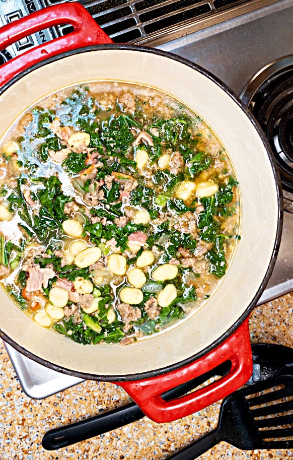 Add gnocchi, separating the individual pieces. Stir in kale then let simmer for five minutes - stirring occasionally to prevent the bottom from burning. Add heavy cream and continue cooking for two minutes.